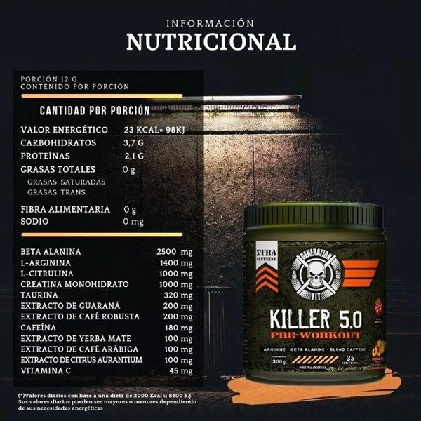 Lleva tu entrenamiento al siguiente nivel con Killer 5.0 Generation Fit, un pre-entrenamiento de alto impacto diseñado para potenciar tu energía, resistencia y concentración.