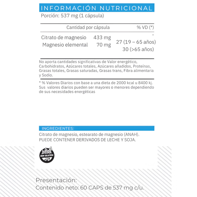 💊 Citrato de Magnesio – Fuente de magnesio con buena absorción, que contribuye al funcionamiento muscular, nervioso y energético.