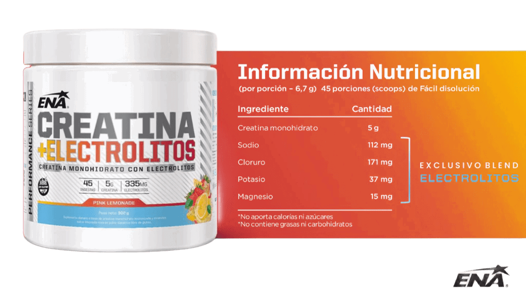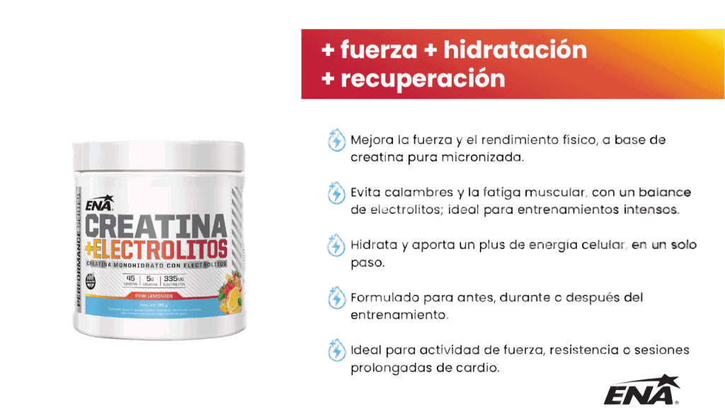 Suplemento diseñado para mejorar la fuerza, el rendimiento y la hidratación durante el entrenamiento, combinando creatina monohidrato con electrolitos esenciales.